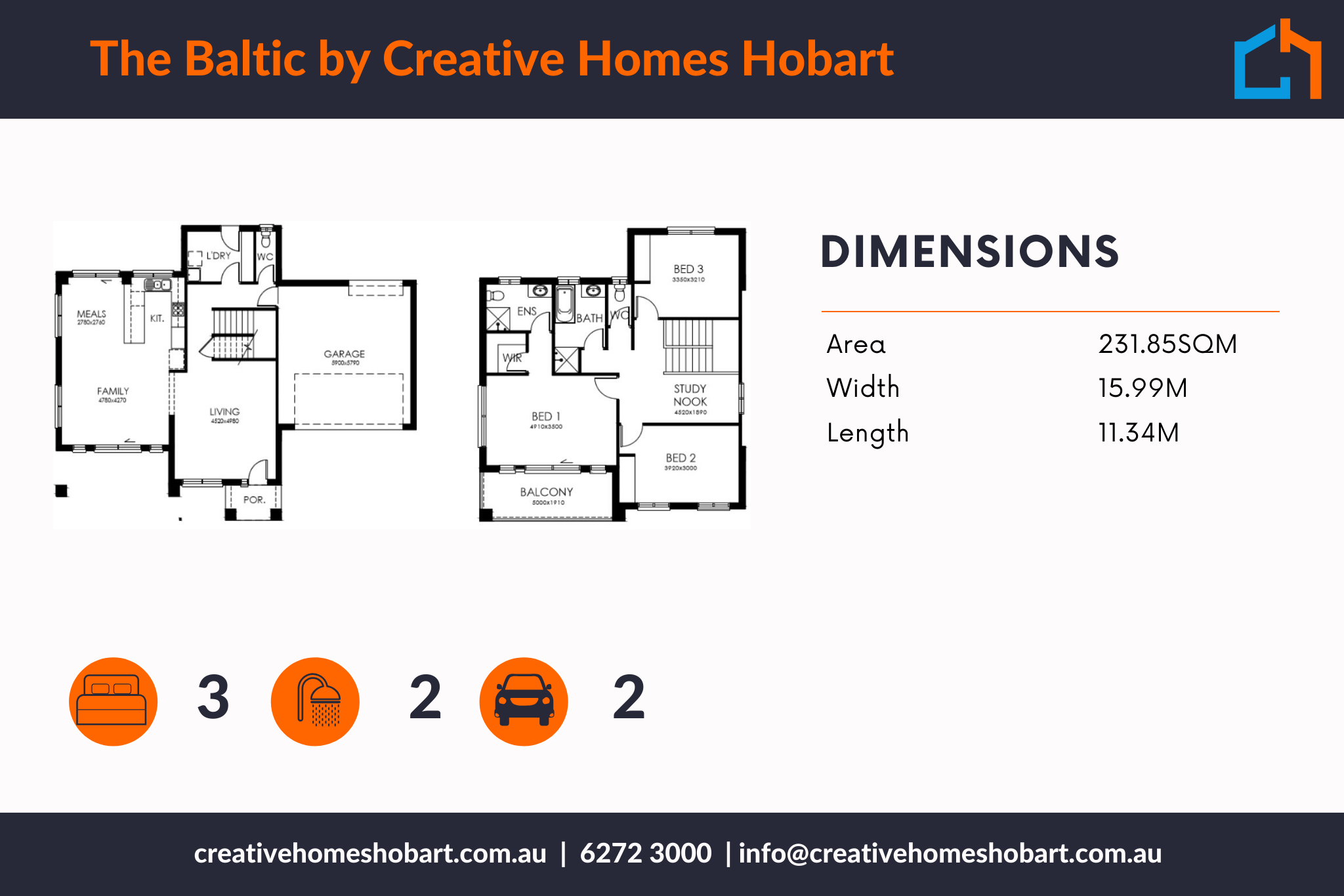The Baltic is a double storey, three bedroom, two bathroom family home. The kitchen opens onto a family zone, including a meals area and adjacent is a separate living space for busy family lifestyles.